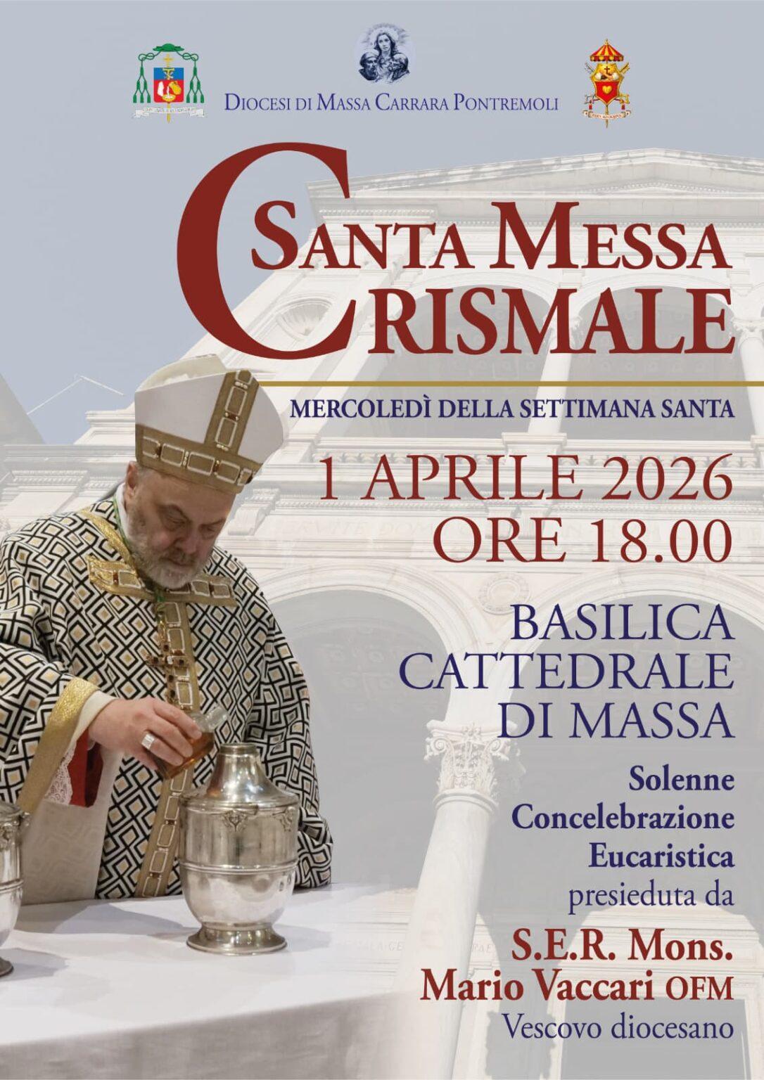 Mercoledì 1° aprile 2026, alle ore 18, nella Basilica Cattedrale di Massa il vescovo Mario presiede la solenne Messa Crismale. La liturgia, prevede il rinnovo delle promesse sacerdotali e la benedizione del Sacro Crisma e degli Oli dei Catecumeni e degli Infermi,”destinati a portare la grazia di Dio nei cuori dei fedeli”, come ha scritto il vescovo nella lettera al clero. “La nostra celebrazione, quest’anno – continua fra Mario – avrà un particolare significato spirituale, collocandosi nel cammino di memoria degli 800 anni della morte di san Francesco d’Assisi (1226-2026). Il suo esempio di povertà evangelica, di fraternità e di amore per la Chiesa ci richiama alla gioia di essere ministri di misericordia e strumenti di pace, umili servitori del ‘Vangelo sine glossa’”.